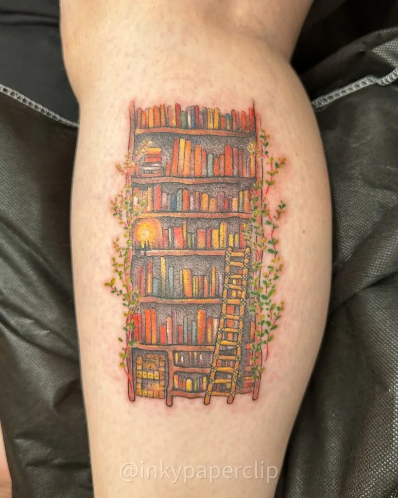 This tattoo features a warm, colorful bookshelf scene decorated with climbing vines and glowing light details. Brightly shaded books fill the shelves, creating a lively sense of knowledge and imagination.