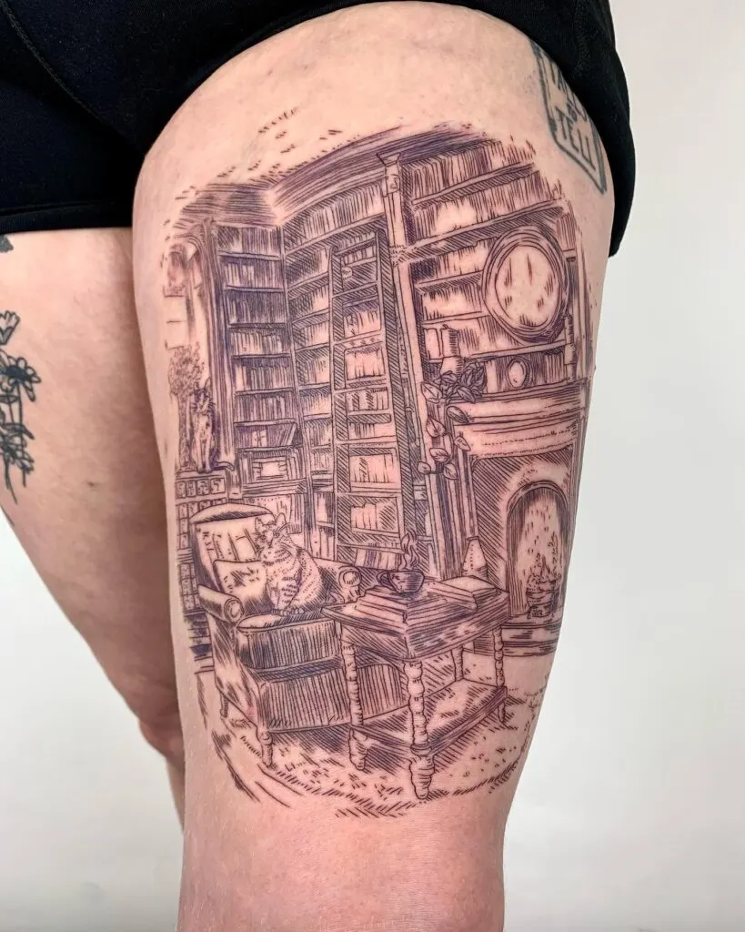 Cozy Library Scene with Cat Tattoo