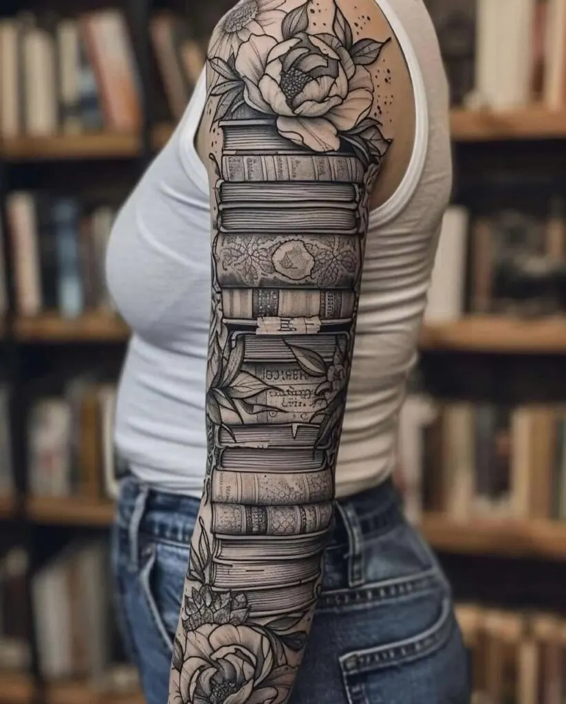 Elegant Floral Book Stack Sleeve Tattoo
