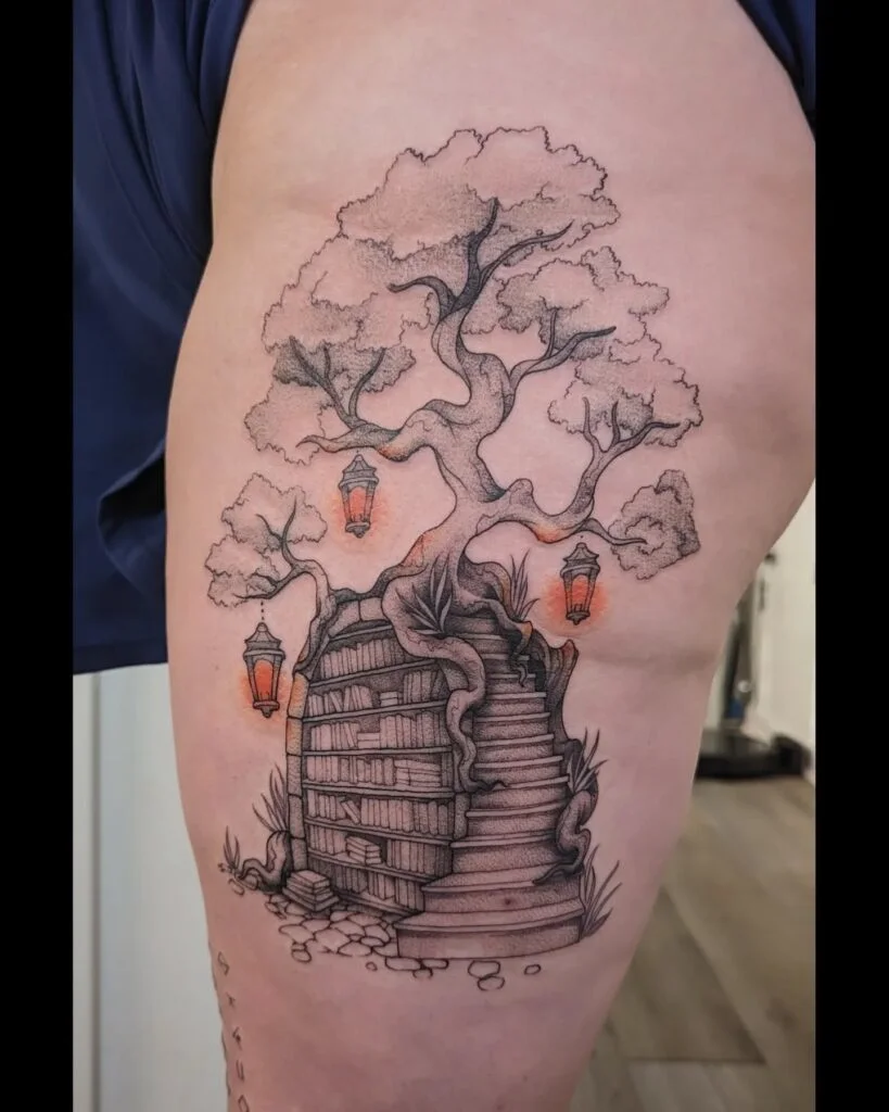 This tattoo blends nature and literature, depicting a large tree growing atop a bookshelf staircase. The shelves are seamlessly integrated into the trunk’s base, while winding roots and stone steps create an inviting pathway upward.