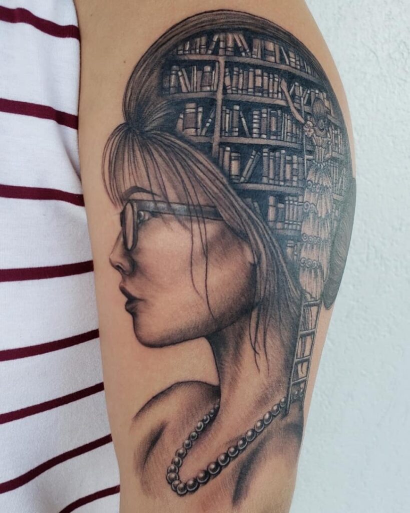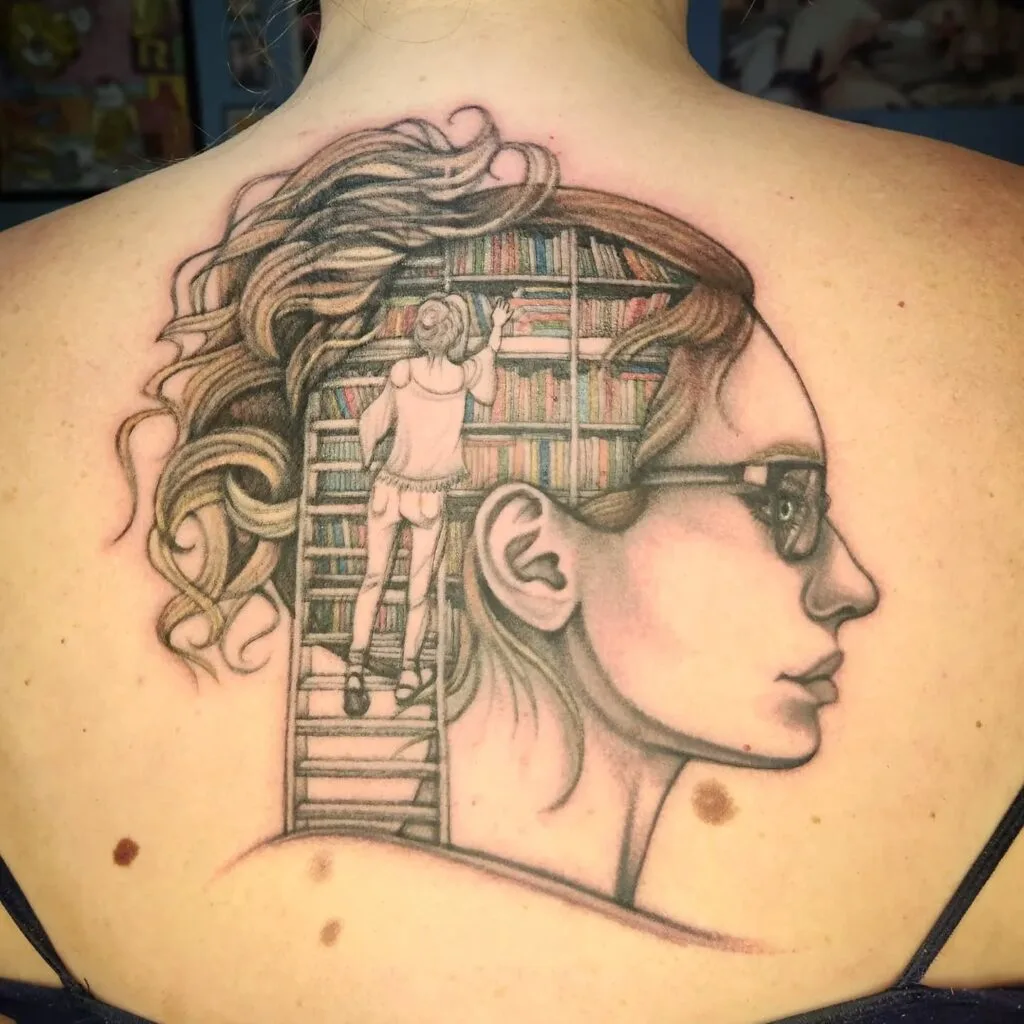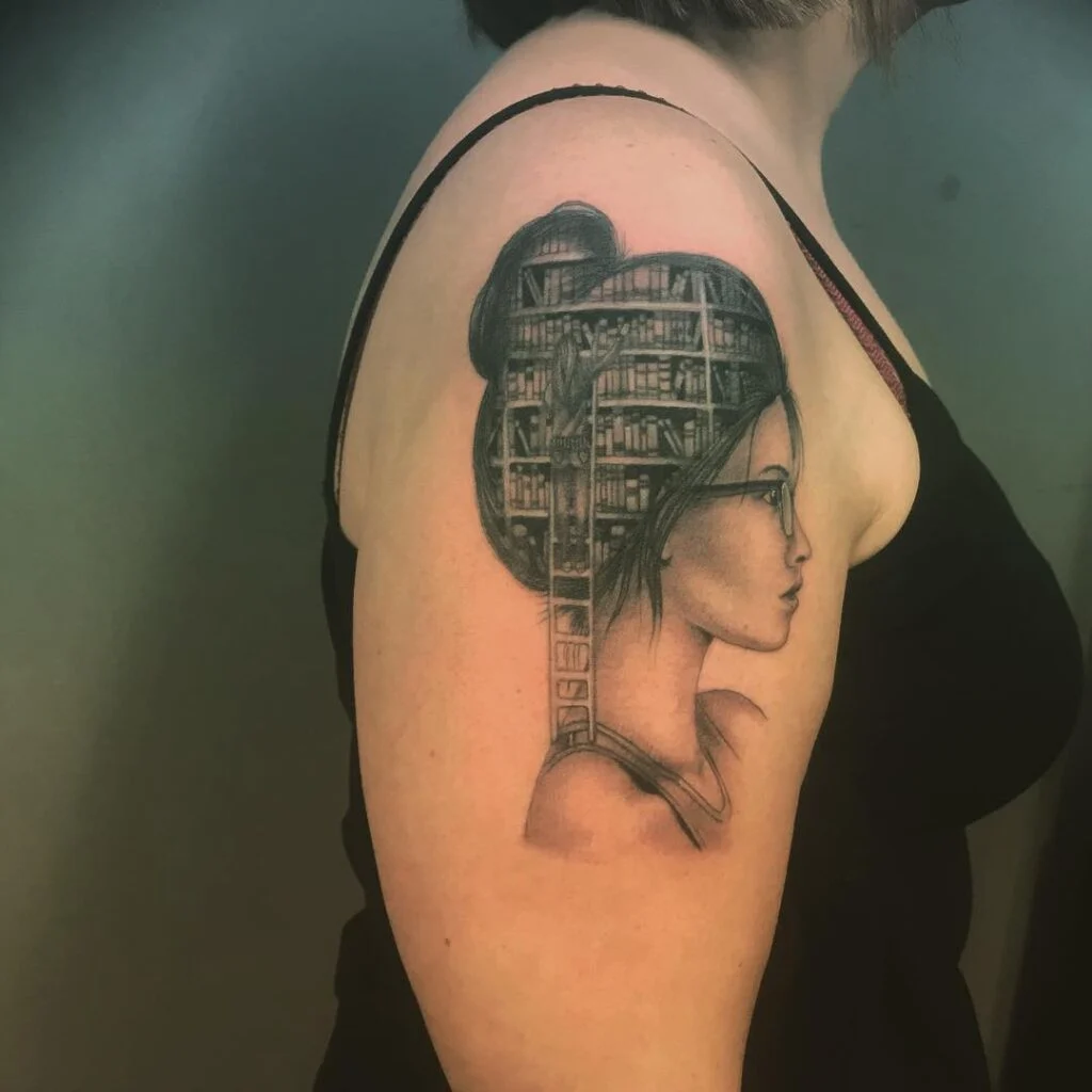 This tattoo presents a profile of a woman whose flowing hair frames a circular library scene within her head. Inside, a girl stands on a ladder, reaching for books, adding narrative depth to the design.