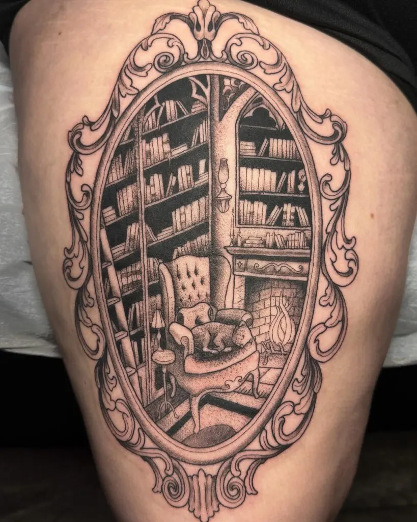 This tattoo portrays a warm library scene enclosed in an ornate, vintage-style frame, resembling a treasured illustration. Inside, shelves filled with books surround a tufted armchair placed beside a crackling fireplace, radiating comfort.