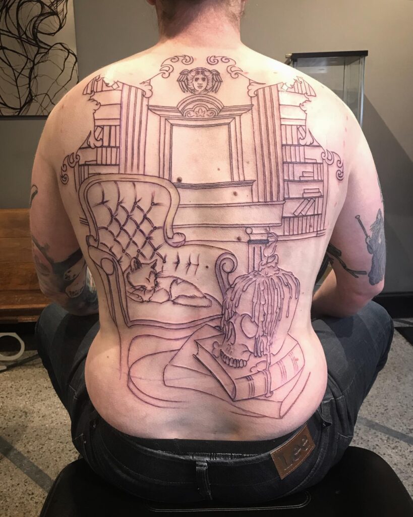 This large back tattoo sets the stage for an elaborate library scene with gothic undertones. At its center, tall bookshelves and ornate architectural details frame the composition, while an elegant tufted chair anchors the lower section.