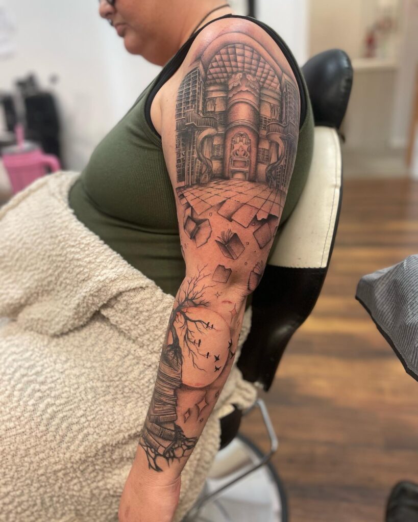 This tattoo sleeve creates the illusion of stepping into an expansive library hall filled with towering shelves and ornate arches. The upper arm showcases a vaulted ceiling and sweeping architectural details, complete with columns and a central doorway.