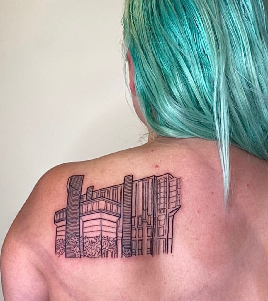 This tattoo features a clean linework depiction of Robarts Library, an iconic Brutalist building in Toronto. The sharp geometric shapes and towering verticals are captured with precision, highlighting the structure’s distinctive architectural style.