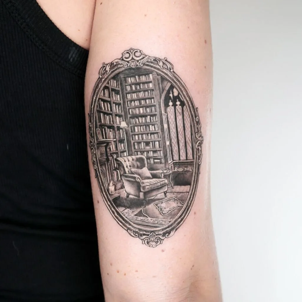 This tattoo captures the timeless charm of an old library framed in an ornate oval design. Inside, a cozy armchair sits beside tall bookshelves and an elegant arched window, creating a warm and inviting scene.