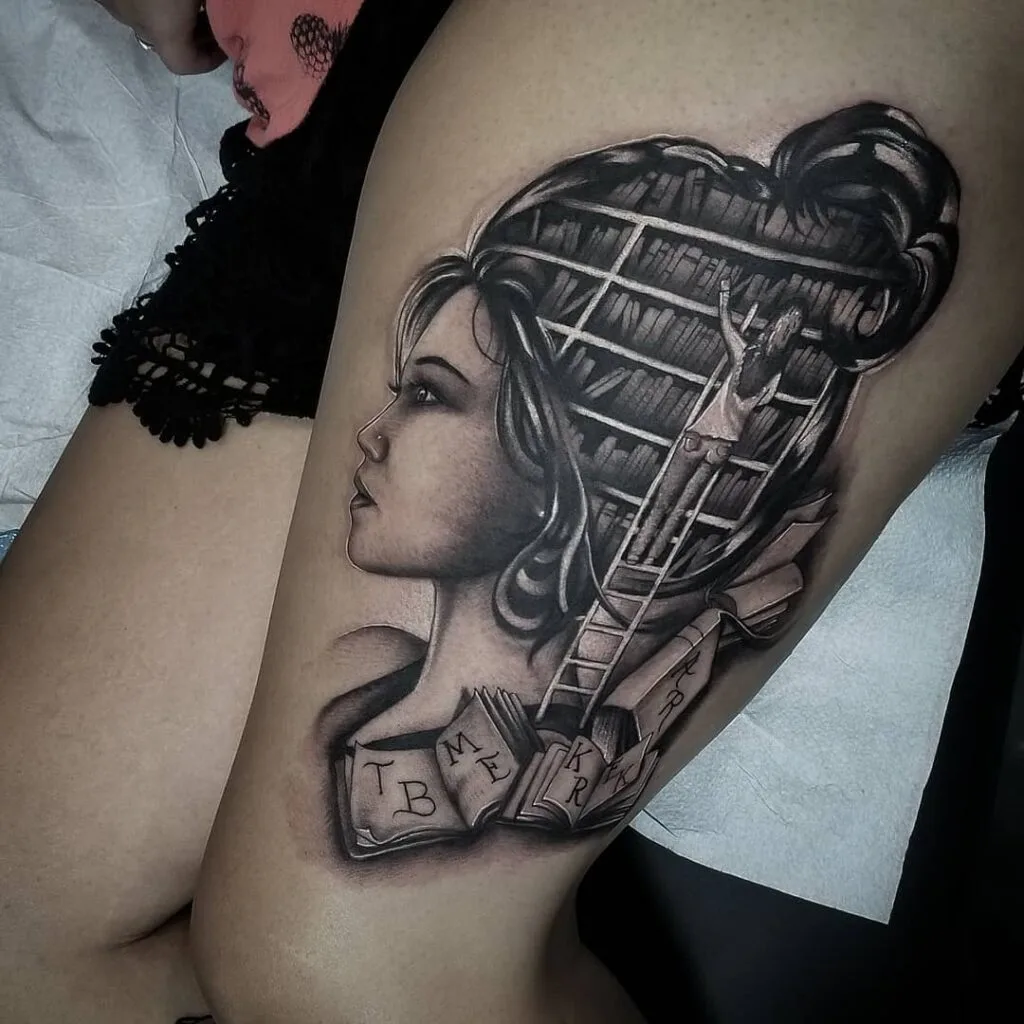 This tattoo blends portrait realism with surreal creativity, showing a woman whose hair transforms into bookshelves. A small figure climbs a ladder within the shelves, adding narrative and dimension to the design.
