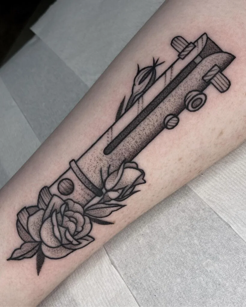 This bold blackwork tattoo features one of Ahsoka Tano’s lightsabers, rendered with sharp lines, dotwork shading, and surrounded by blooming roses. The saber is instantly recognizable for its curved design and dual button placement, paired here with classic roses that soften the weapon’s form.