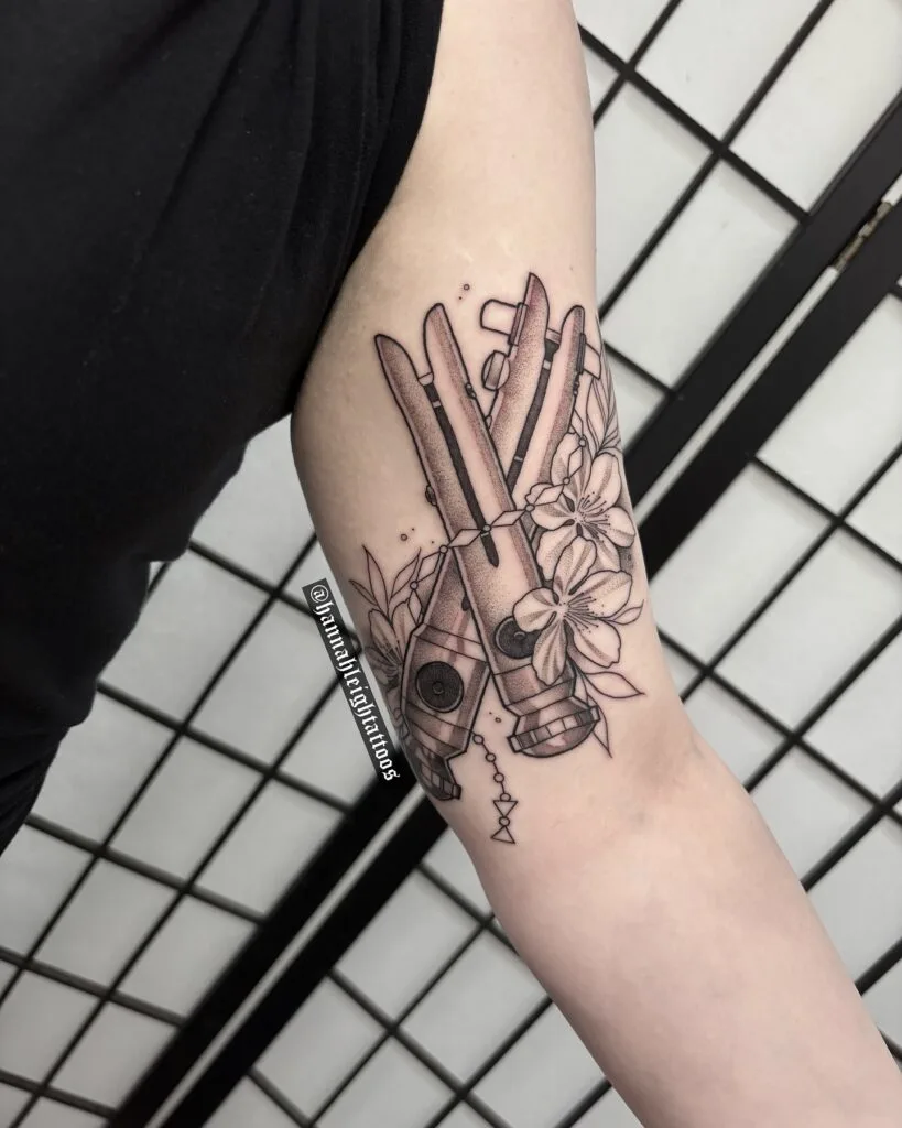 This graceful forearm tattoo features Obi-Wan Kenobi’s iconic lightsaber hilt, reimagined as the base of a blooming bouquet of blue irises. The finely detailed black and grey hilt transitions seamlessly into delicate stems and vibrant petals, replacing the blade with soft floral elegance.