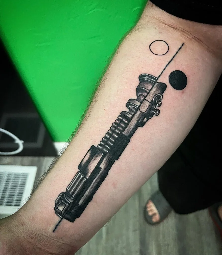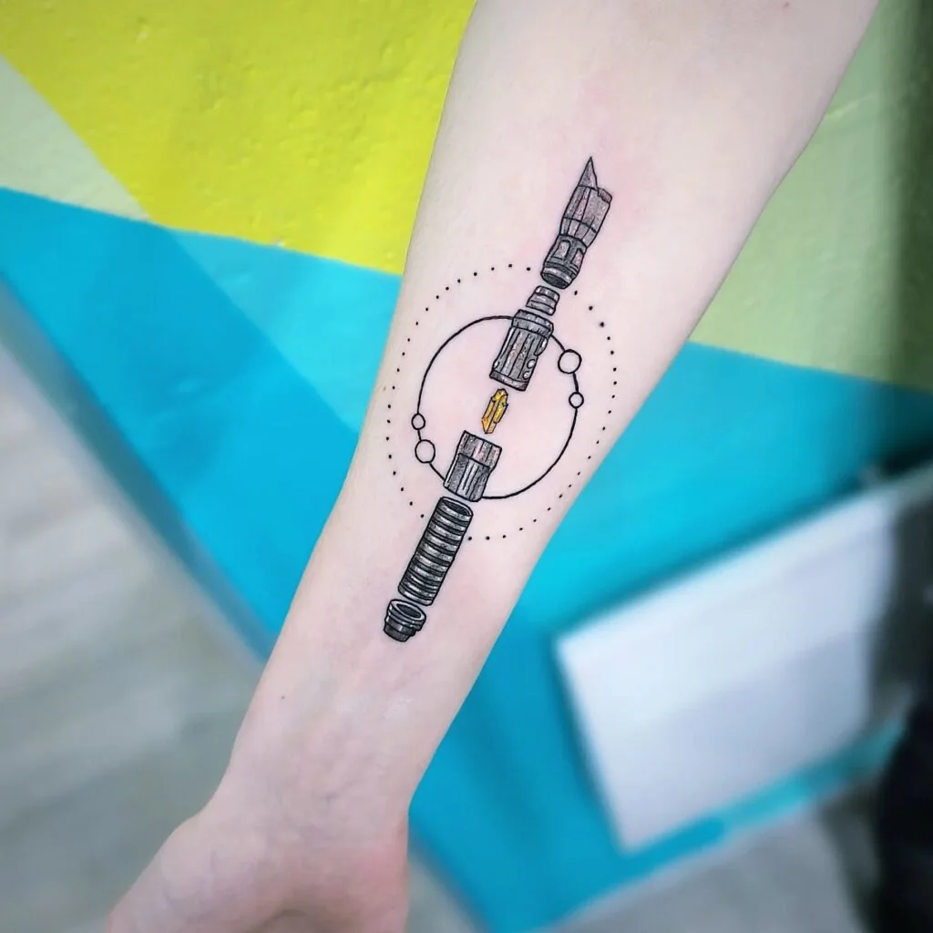This unique forearm tattoo blends the classic design of a lightsaber hilt—resembling Luke Skywalker’s—with modern geometric elements. Circles, lines, and dotwork orbit the weapon like celestial bodies, giving the piece a cosmic and technical feel.