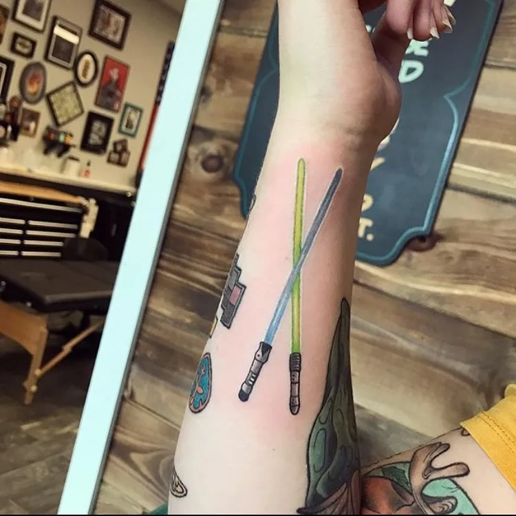 This playful forearm tattoo features two crossed lightsabers—one glowing blue and the other radiant green—symbolizing unity and duality in the Star Wars universe.