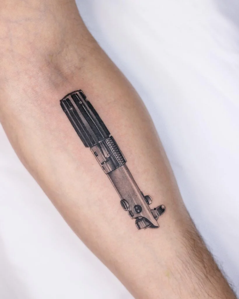 This forearm tattoo delivers a hyper-realistic depiction of Luke Skywalker’s iconic lightsaber, rendered with incredible depth and precision. The metallic sheen, golden accents, and intricate textures give the hilt a three-dimensional look, as if it were forged directly onto the skin.