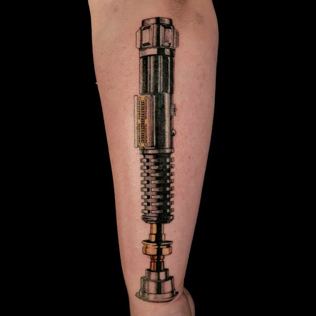 This tattoo features the iconic hilt of Luke Skywalker’s lightsaber, detailed in bold black and metallic grey tones with golden and red accents.