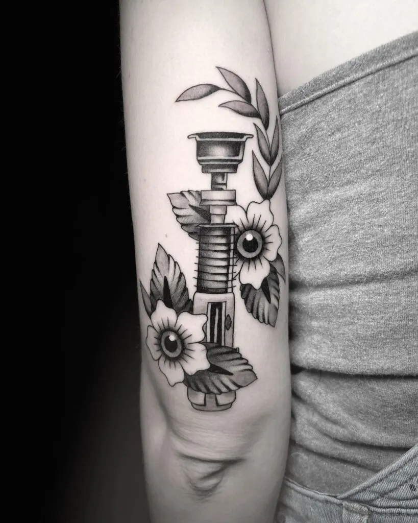 This striking black and grey tattoo showcases Darth Maul’s double-bladed lightsaber surrounded by soft botanical elements. The floral and leafy details wrap around the weapon, creating a beautiful contrast between nature and machinery.