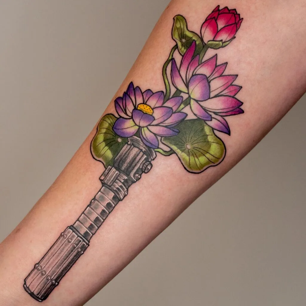 This stunning forearm tattoo merges Mara Jade’s sleek pink-bladed lightsaber hilt with a bouquet of vibrant water lilies. The hilt anchors the design at the base, while rich green leaves and lotus blooms in shades of pink and purple replace the traditional blade, symbolizing grace and transformation.