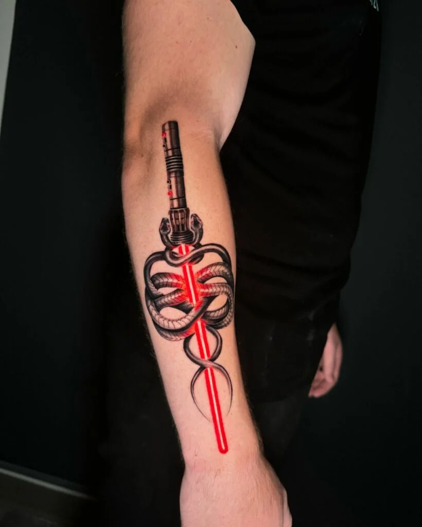 This striking tattoo combines a red-bladed Sith lightsaber with a coiled black snake wrapped around its hilt and beam. The glowing red blade cuts through the forearm with vivid intensity, while the serpent adds a dark, menacing energy to the design.