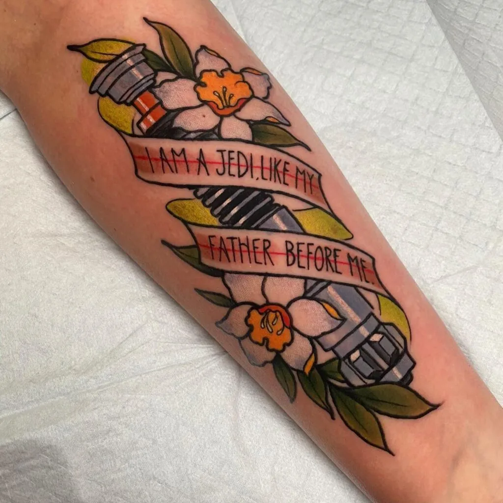 This bold and heartfelt tattoo features two iconic lightsaber hilts surrounded by floral accents and a flowing banner with the powerful quote: “I am a Jedi, like my father before me.”