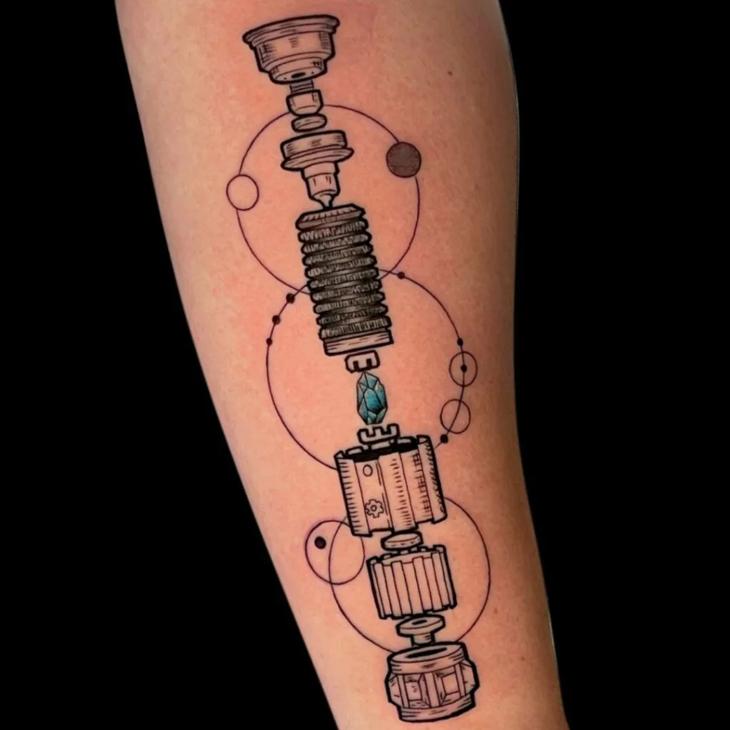 This tattoo presents a unique exploded view of a lightsaber, as if pulled apart to reveal its inner mechanics. Each section of the hilt is suspended in space, orbiting a central glowing blue kyber crystal.