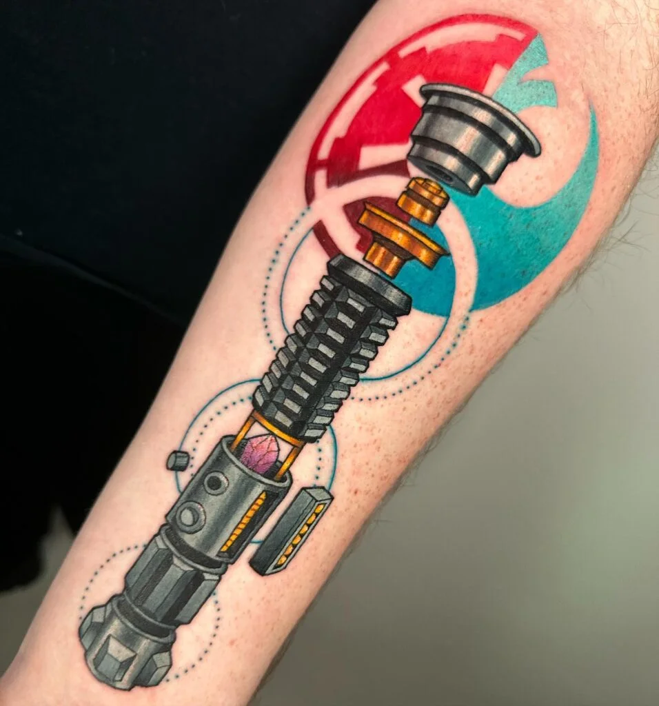 This bold and colorful forearm tattoo features a fully assembled lightsaber hilt, surrounded by dotted design elements and framed by the opposing emblems of the Jedi Order and the Galactic Empire.