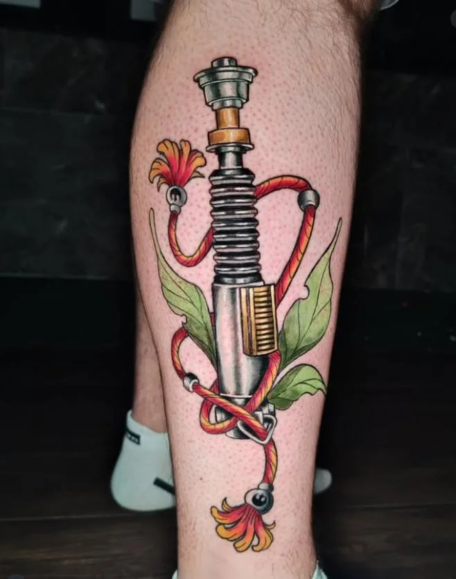 This striking calf tattoo features Luke Skywalker’s iconic lightsaber hilt wrapped in a flowing red-and-yellow rope, accented by lush green leaves and vivid floral tassels. The saber is inked with metallic precision, highlighting the familiar gold control panel and ribbed black grip.
