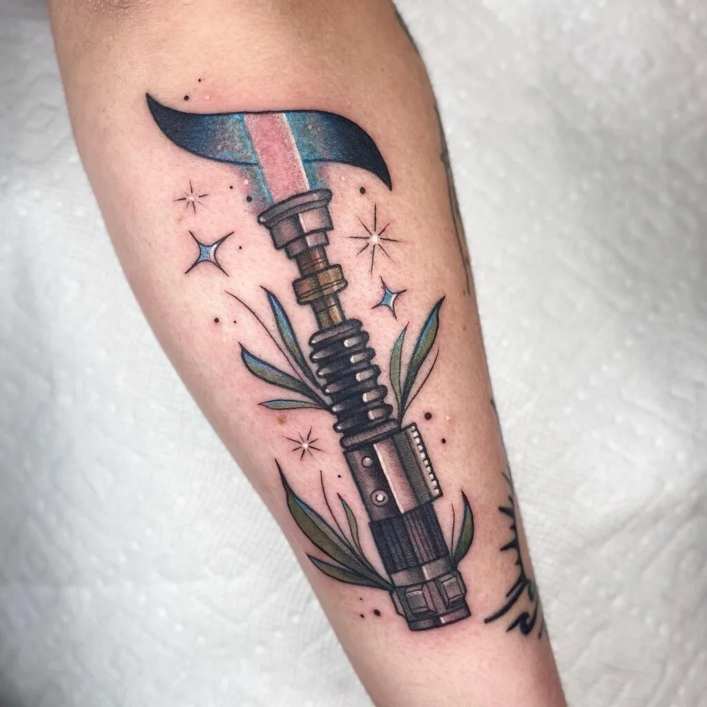 Lightsaber tattoos capture the epic spirit, courage, and adventure of the Star Wars universe, symbolizing strength, balance, and a personal connection to the iconic saga. These designs serve as powerful expressions of loyalty, bravery, and the timeless struggle between good and evil.