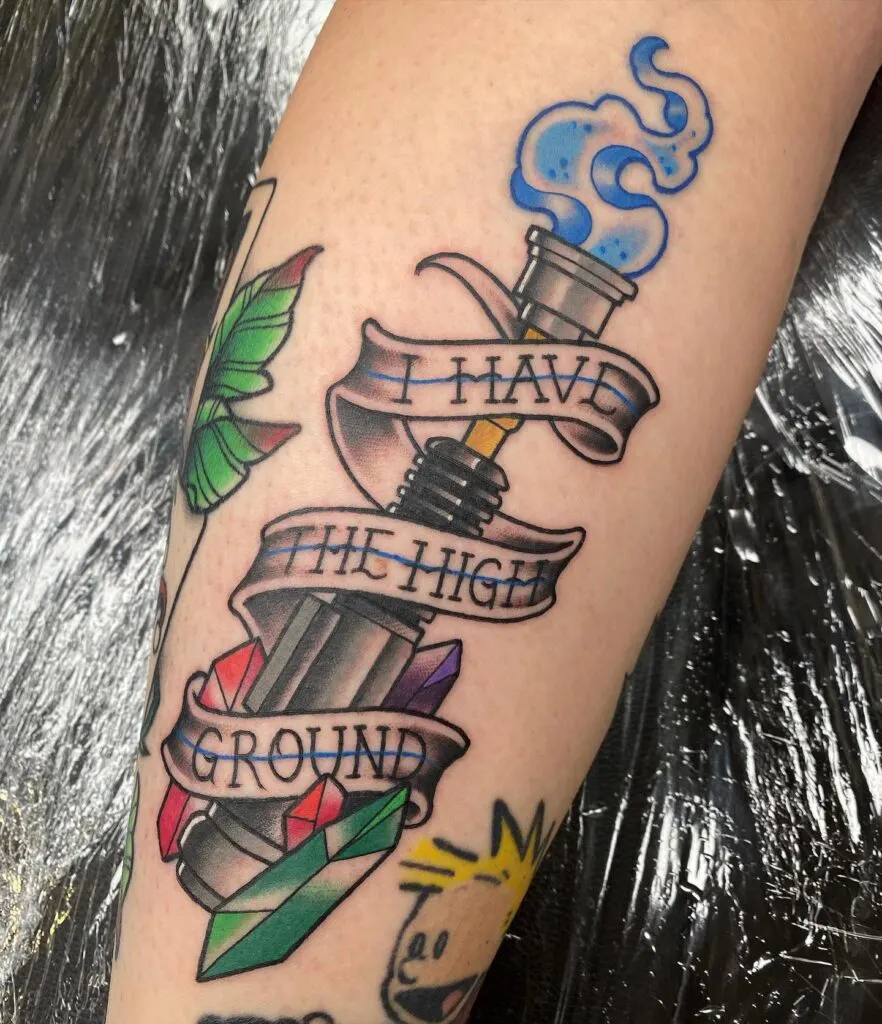 This colorful and humorous tattoo features Obi-Wan Kenobi’s lightsaber wrapped in a flowing banner that reads the legendary quote: “I have the high ground.” The hilt is detailed in bold traditional style, surrounded by vibrant crystals in red, green, and purple tones.