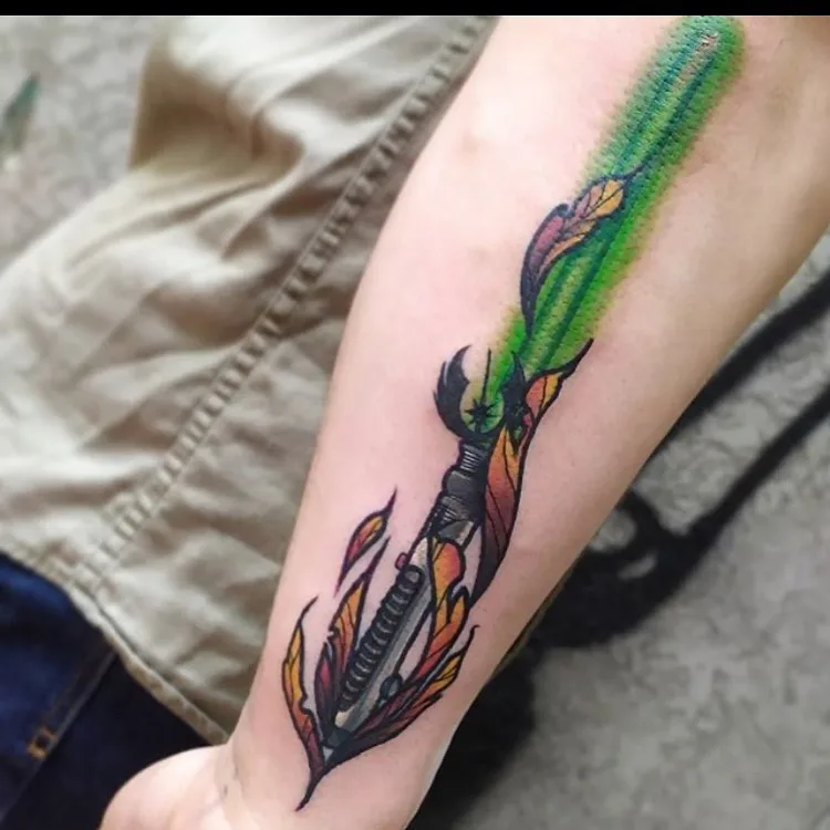 This vibrant tattoo features Qui-Gon Jinn’s green-bladed lightsaber, beautifully wrapped in warm-toned leaves resembling an autumn breeze.