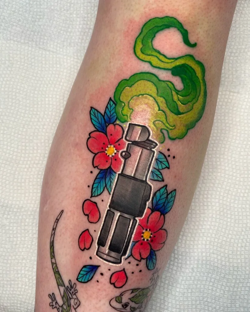 Vibrant Lightsaber with Floral and Smoke Tattoo