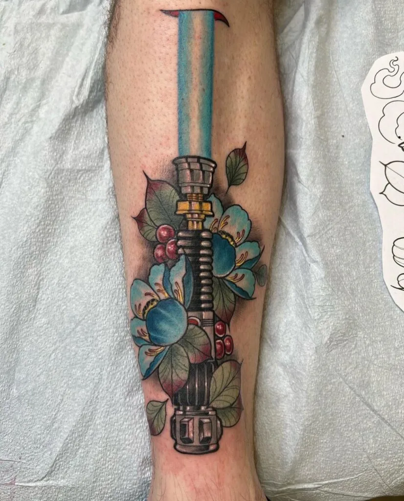 Vibrant Obi-Wan Lightsaber and Blue Floral Tattoo