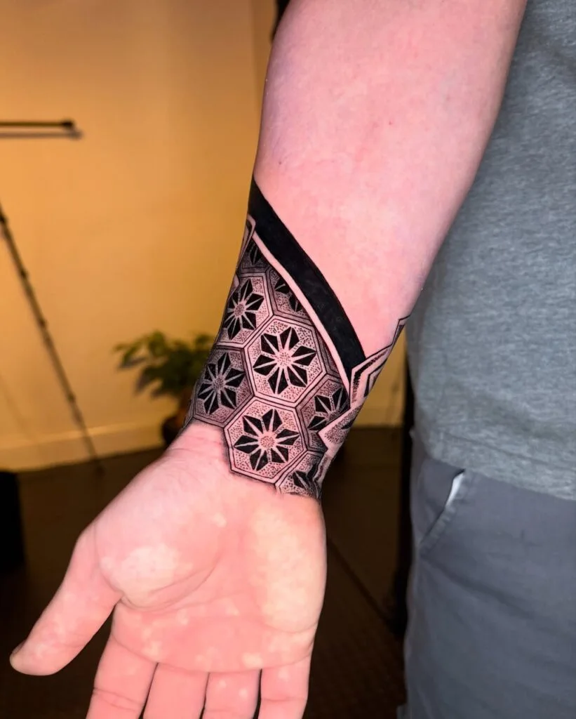 This striking tattoo features a bold black wristband bordered by intricate hexagonal patterns, each containing a symmetrical star-like flower. The use of precise dot-work shading brings depth and contrast to the design, while the sharp lines of the geometric shapes add structure.