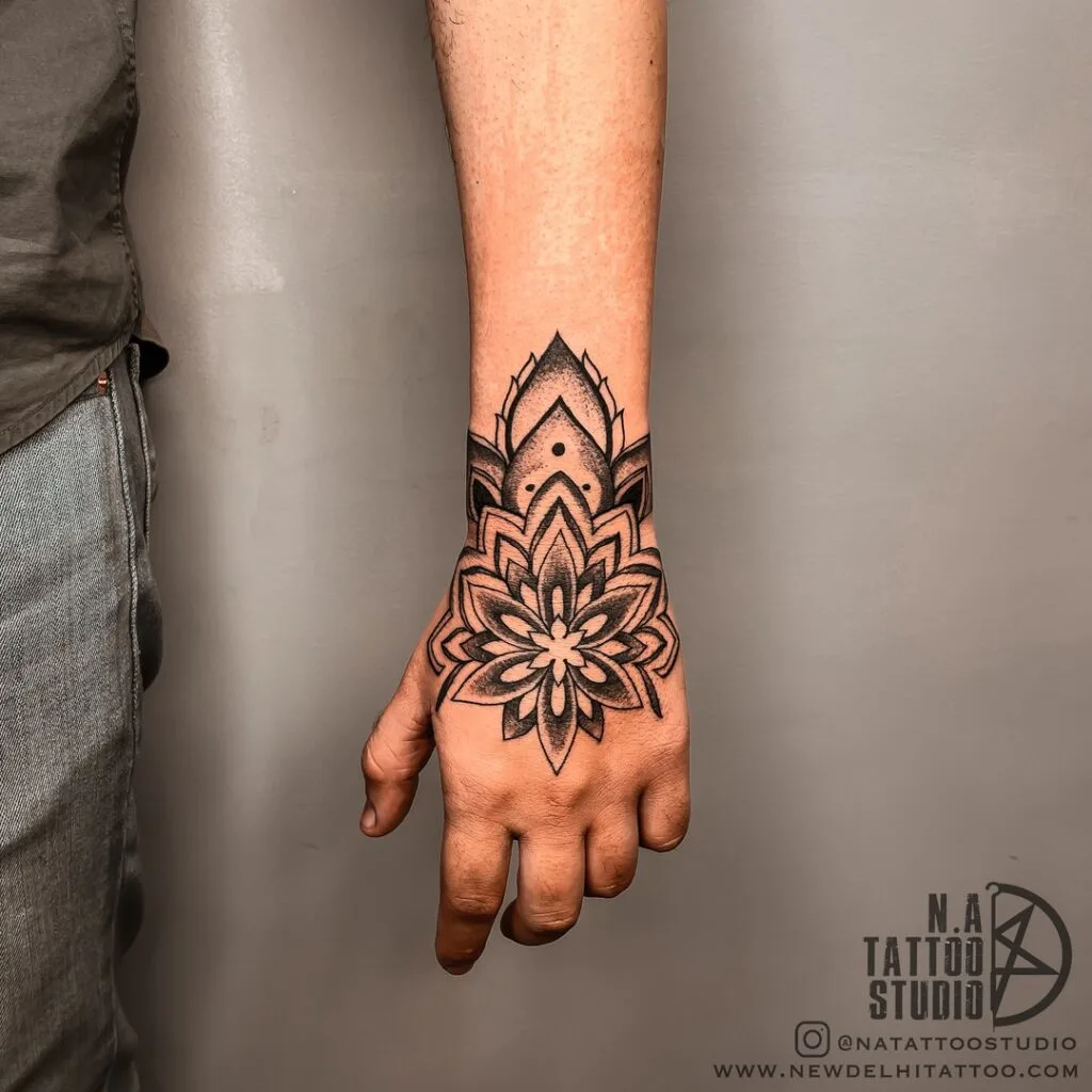 This elaborate wrist tattoo features a beautifully detailed mandala design centered around a blooming lotus. Deep shading and bold outlines enhance the layers of petals, creating a rich contrast and three-dimensional depth.