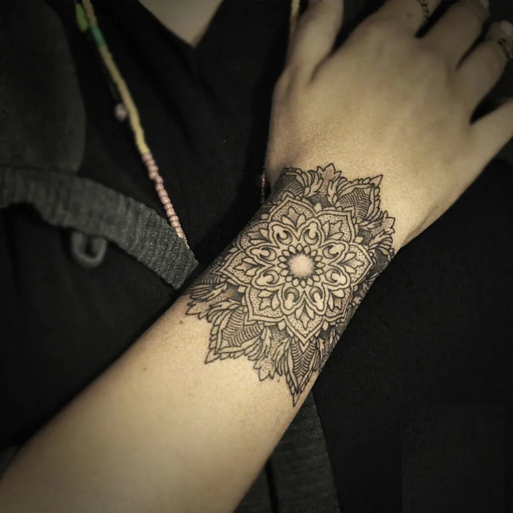 This mandala bracelet tattoo wraps gracefully around the wrist, creating a bold and elegant cuff-like effect. The symmetrical shapes and subtle dotwork details give the design balance and texture, while the bold horizontal band anchors the pattern, making it stand out.