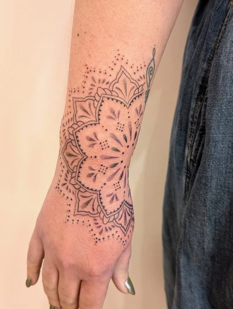 Decorative Mandala Wrist Tattoo with Dotwork Accents