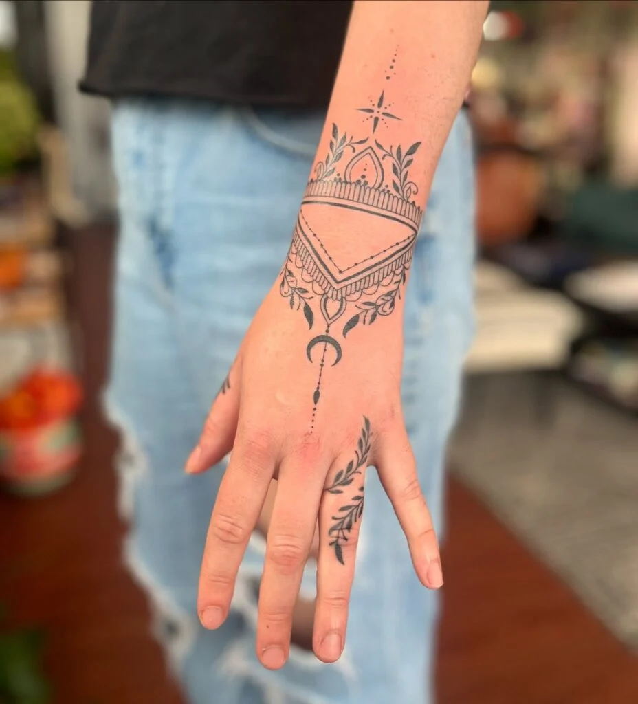 Small dotwork and leaf accents add subtle detail, giving the design a light, airy feel. Placed on the hand, this ornamental tattoo complements the natural contours of the body, making it look like a permanent piece of elegant jewelry that celebrates artistry and style.