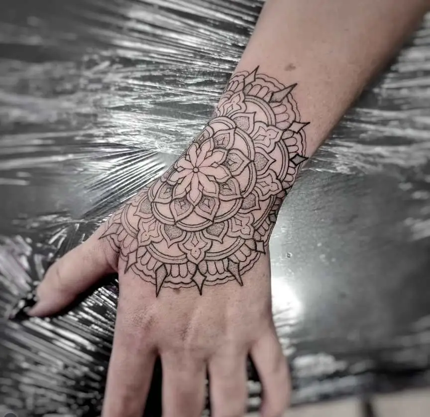 Ornamental Mandala-Inspired Hand and Wrist Tattoo