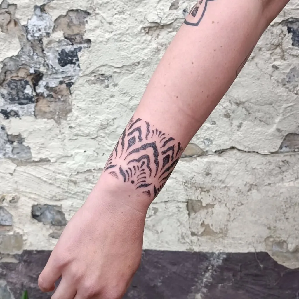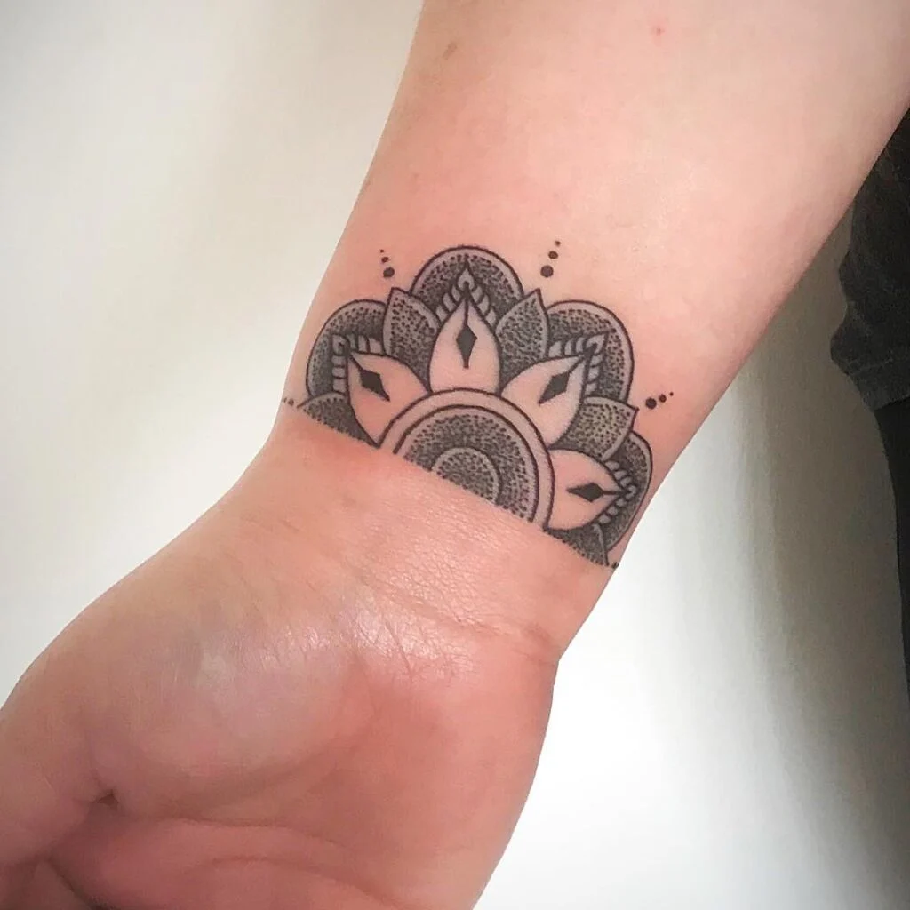 This mandala bracelet tattoo wraps gracefully around the wrist, creating a bold and elegant cuff-like effect. The symmetrical shapes and subtle dotwork details give the design balance and texture, while the bold horizontal band anchors the pattern, making it stand out.