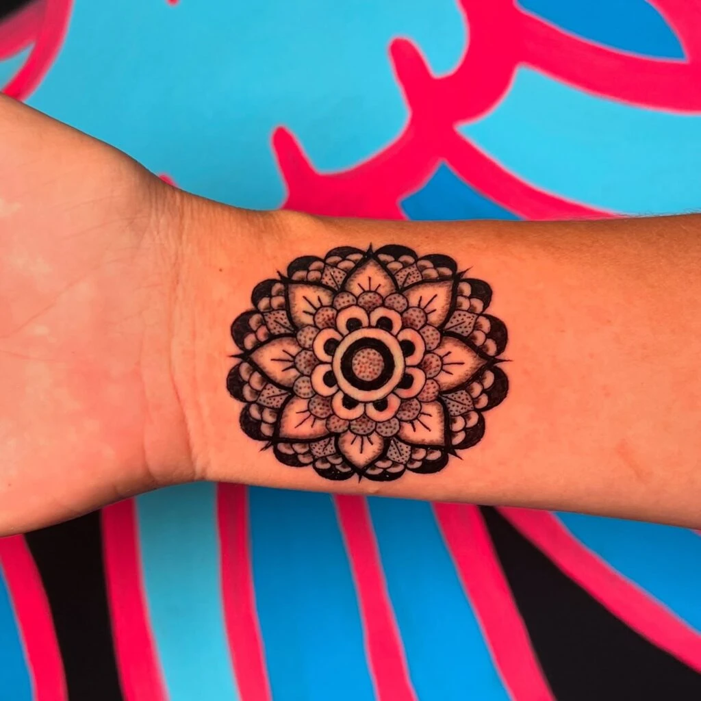 This vibrant mandala wrist tattoo is a captivating centerpiece of bold, intricate shapes. Thick black outlines accentuate each symmetrical layer of petals, while stippled shading adds soft depth and texture to the design.