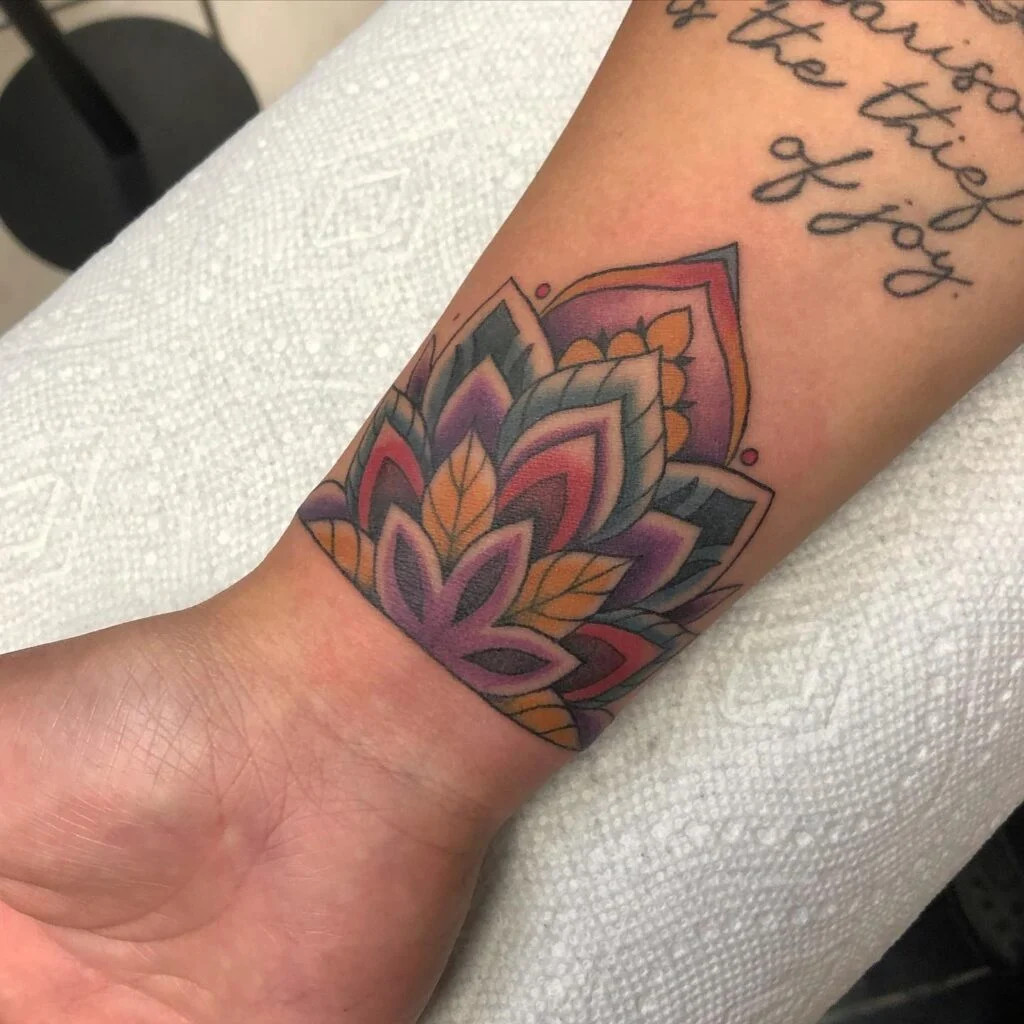 The sharp linework and smooth color gradients give the piece a sense of depth and movement. Wrapped around the wrist like a cuff, this tattoo is perfect for those who want a bright, nature-inspired design that celebrates color, symmetry, and detail. It’s a radiant, wearable artwork that beautifully adorns the skin.