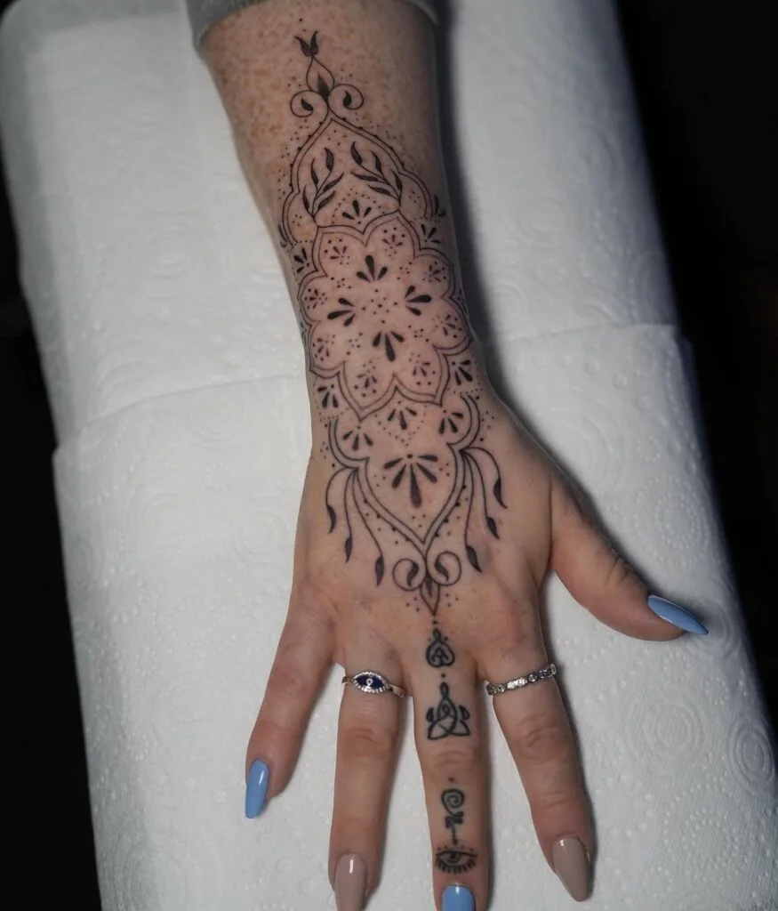 Ornamental Mandala Hand Tattoo with Lace Accents