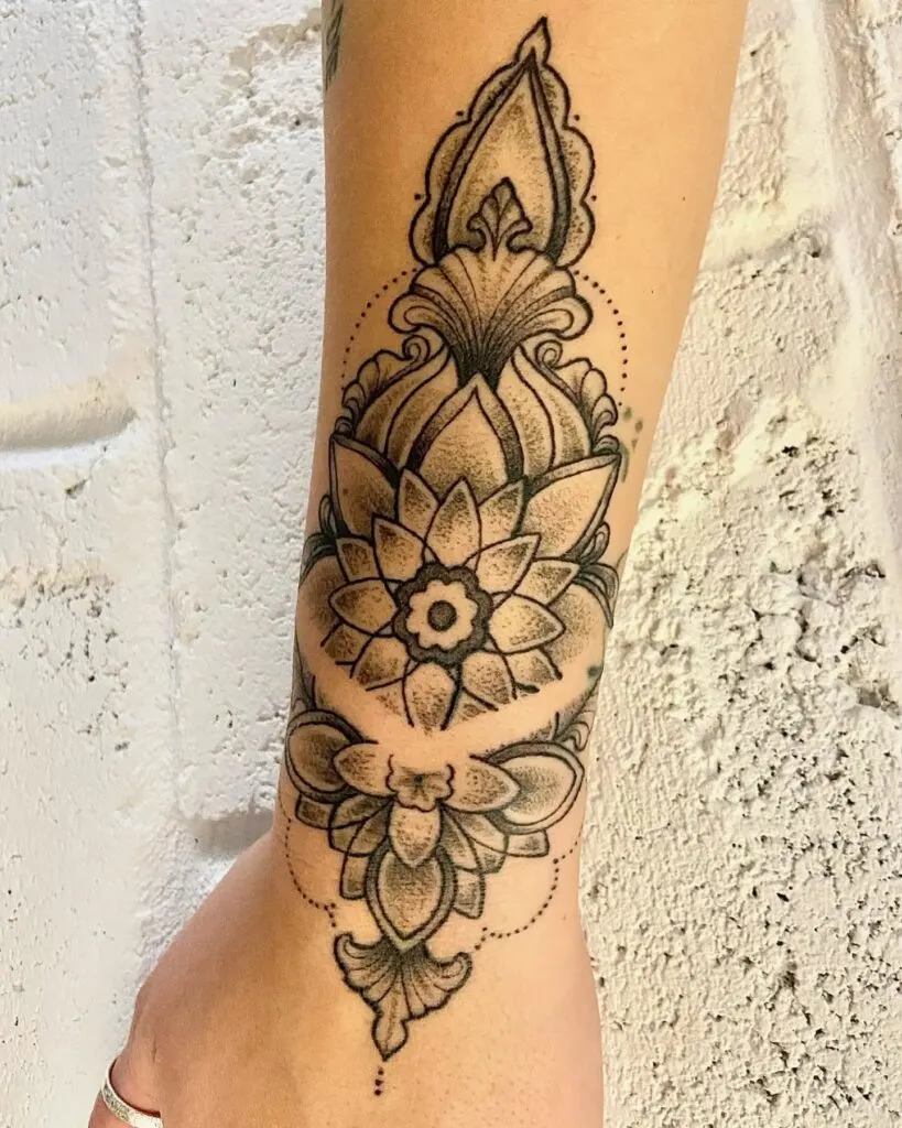The lotus-inspired elements evoke feelings of balance and serenity, making this tattoo a perfect choice for someone who appreciates harmony and inner peace. Designed as a seamless bracelet, it enhances the natural shape of the wrist while celebrating the beauty of mandala artistry.