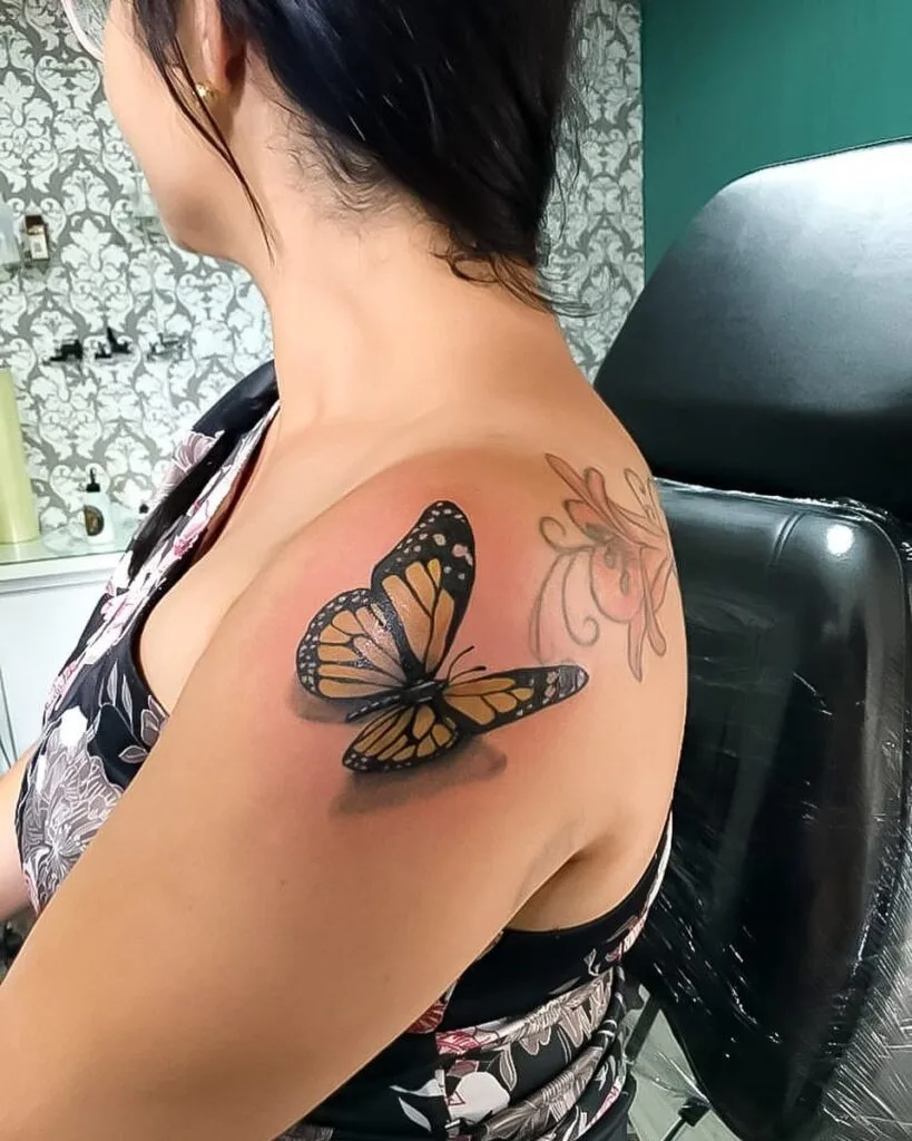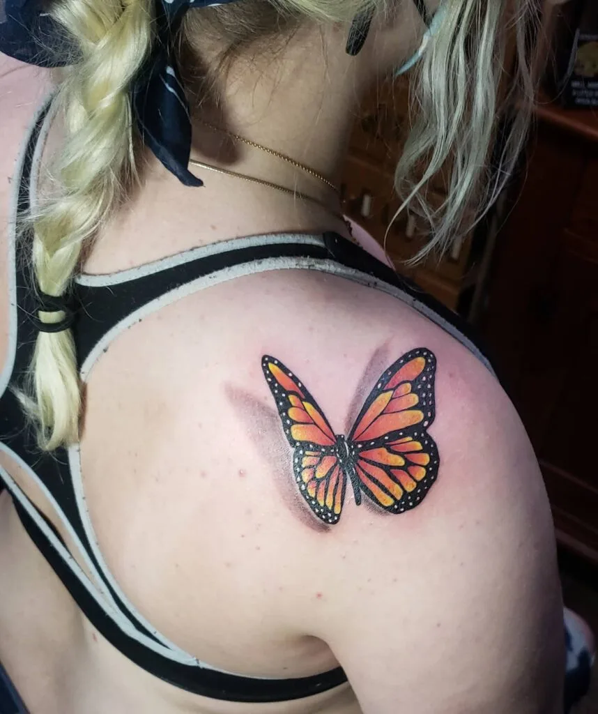 This striking tattoo showcases a realistic monarch butterfly placed on the shoulder, enhanced with a 3D shadow effect.