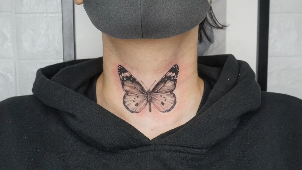 This tattoo features a finely detailed monarch butterfly placed at the center of the neck, just below the chin.