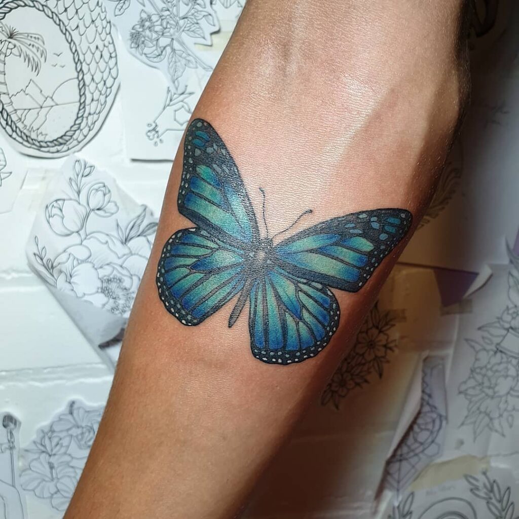 Blue Monarch Butterfly Tattoo on Forearm