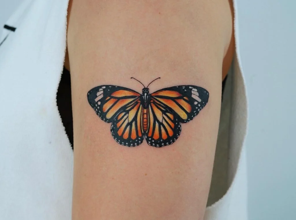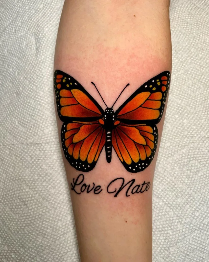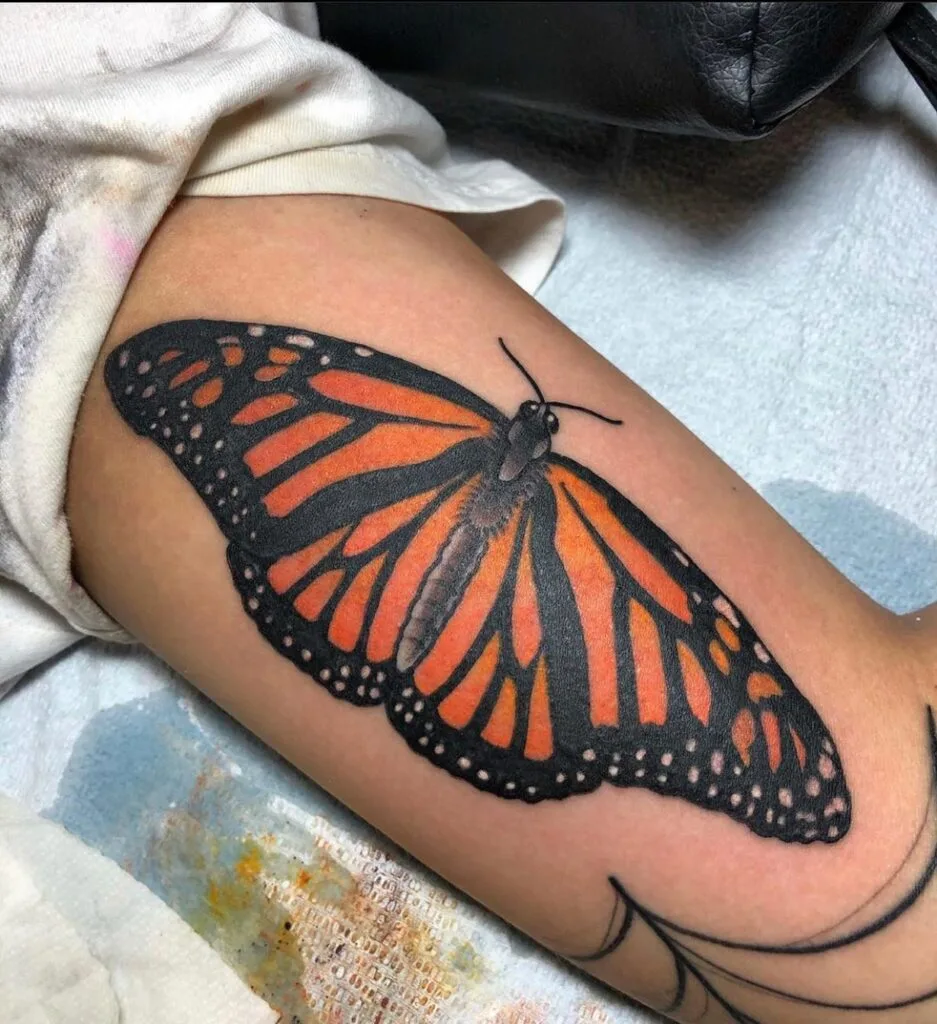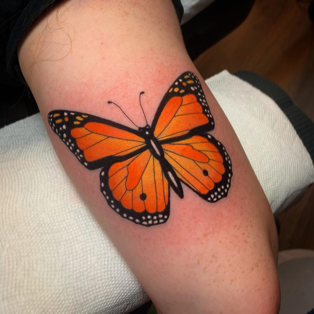 This tattoo features a striking monarch butterfly design with bold, vivid orange wings outlined in deep black.