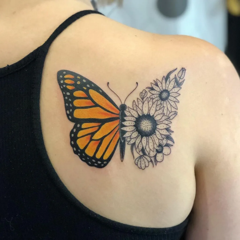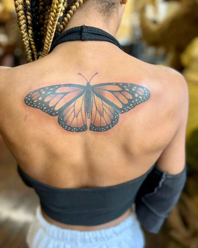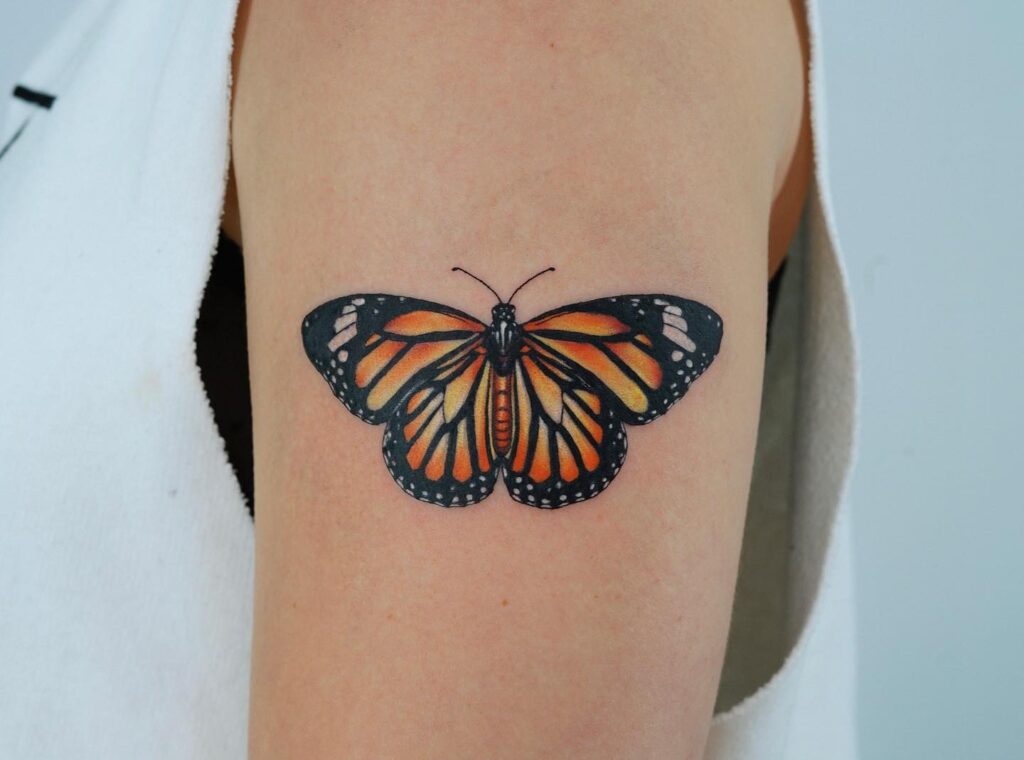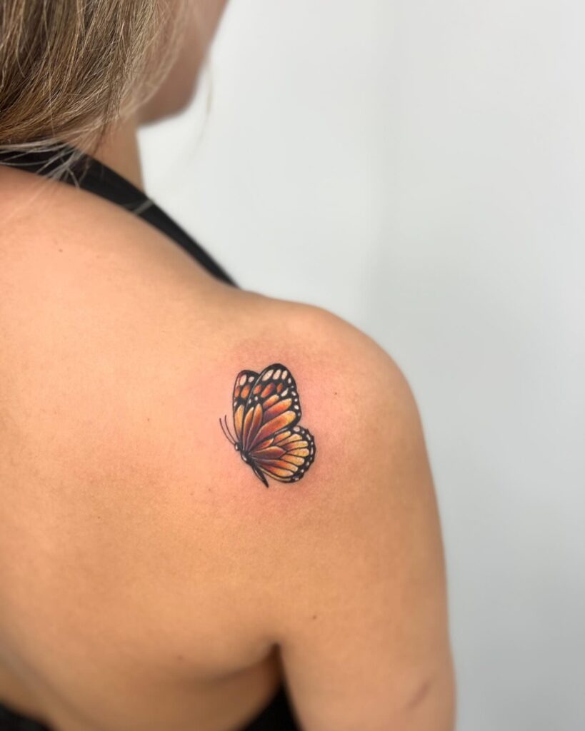This tattoo features a monarch butterfly placed prominently on the shoulder blade, designed with bold outlines and rich orange shading.