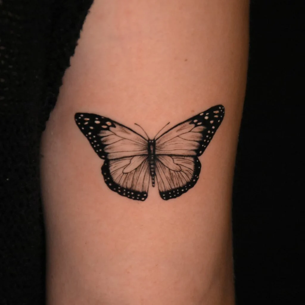 This tattoo showcases a monarch butterfly rendered in fine black and grey shading, creating a soft and realistic appearance.