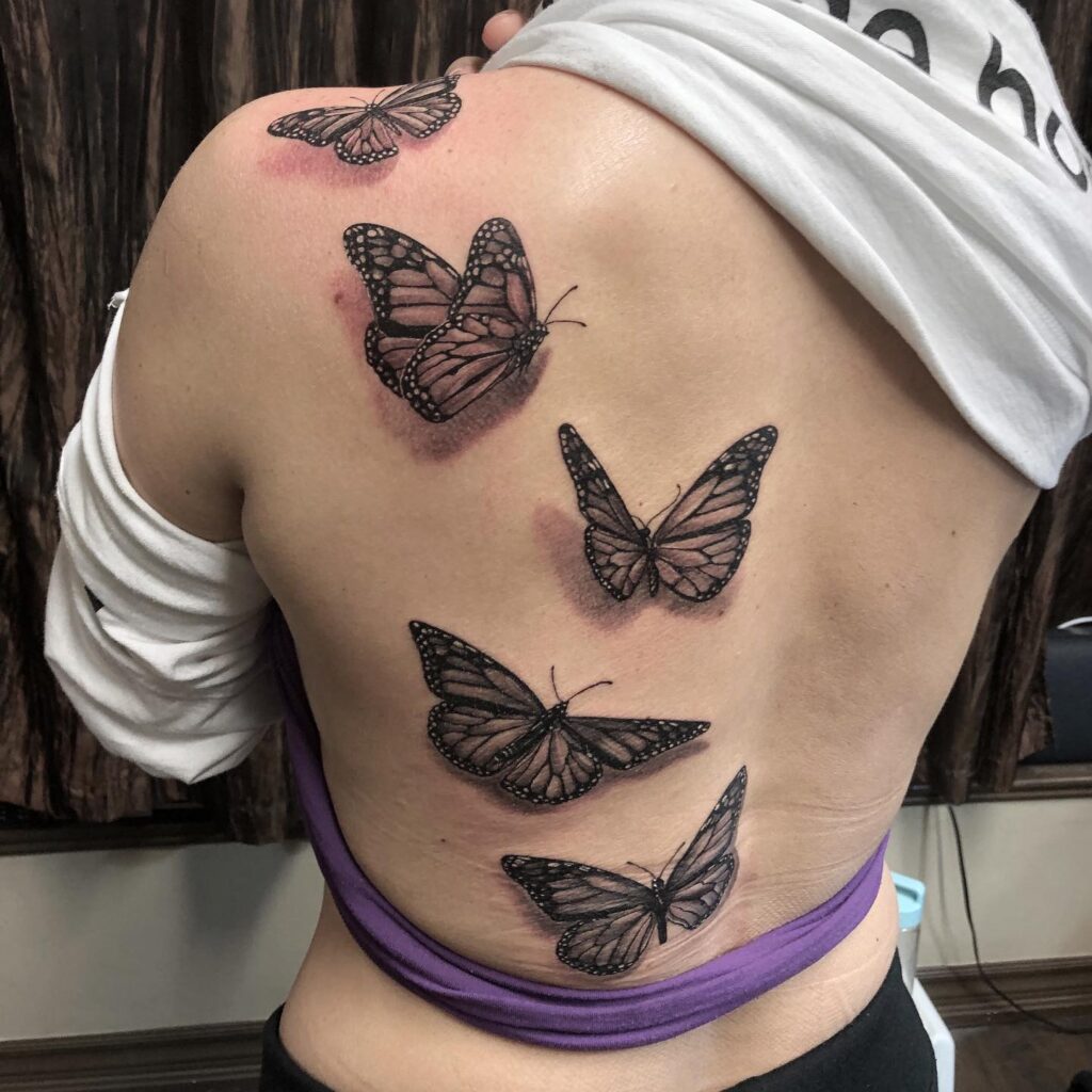 Five Monarch Butterflies Back Tattoo