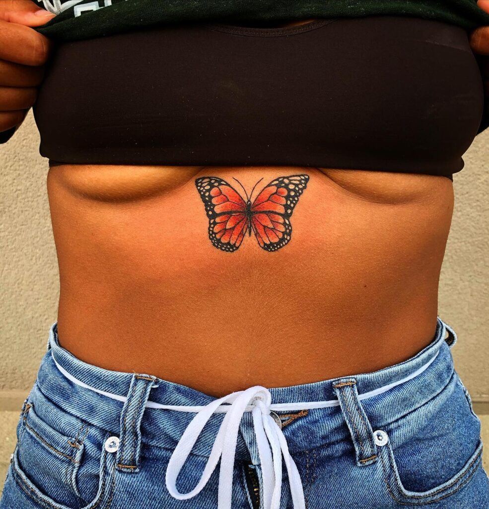 This tattoo features a monarch butterfly centered on the lower stomach, creating a bold and eye-catching placement.