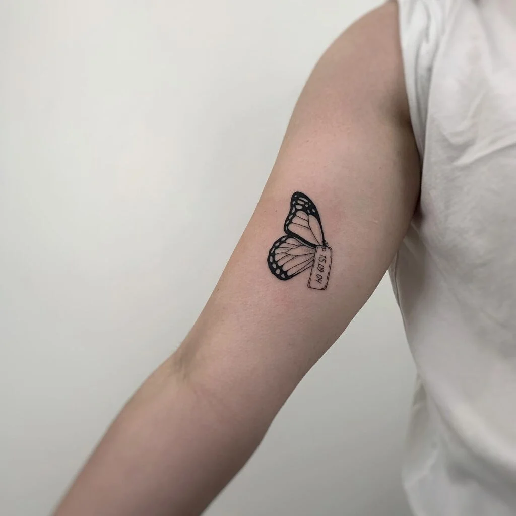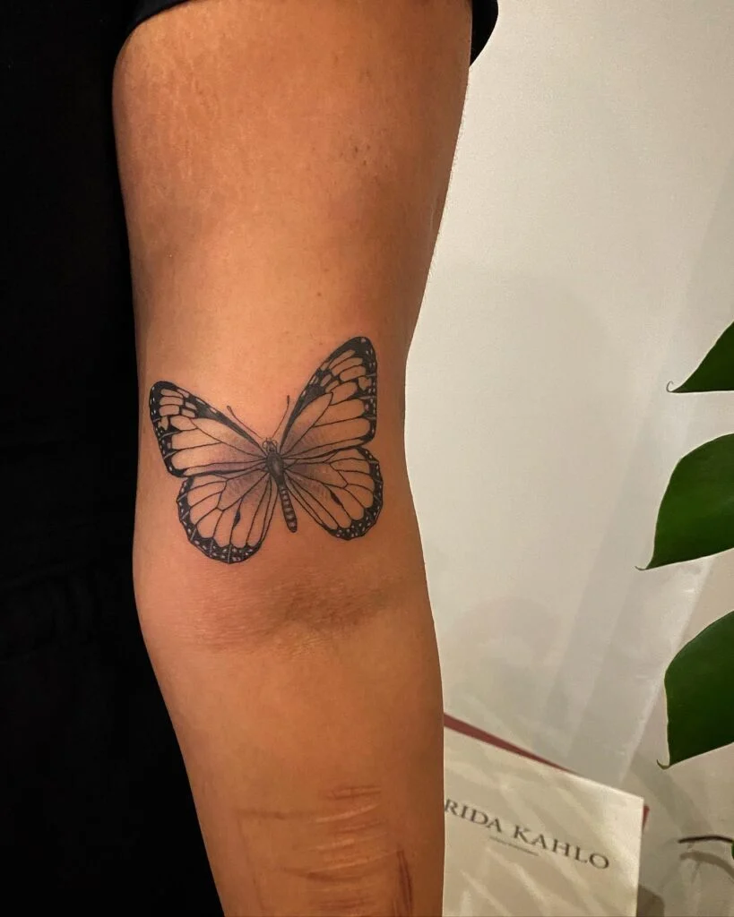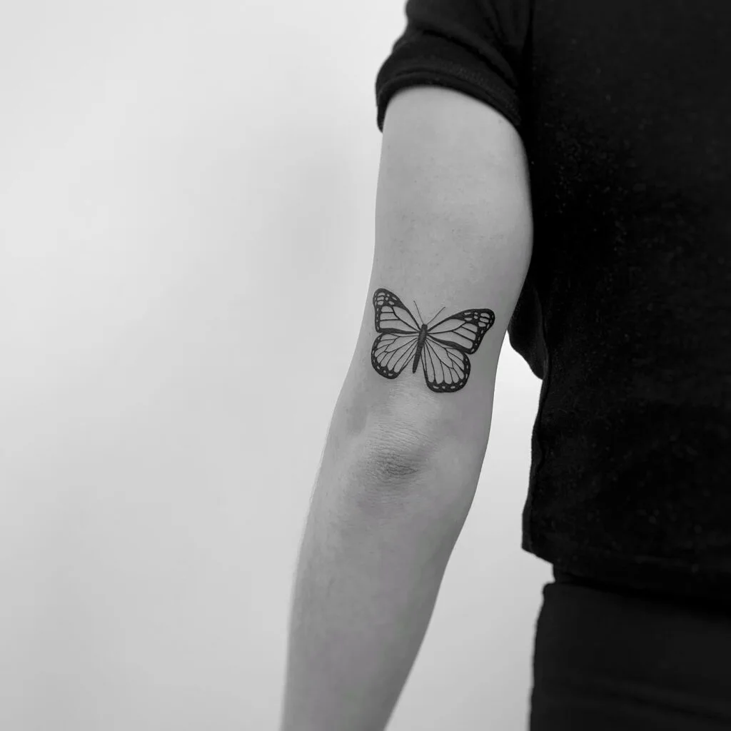 The artist used clean black outlines with subtle shading to capture the butterfly’s delicate wings. The design sits just above the elbow, creating a balanced and eye-catching placement.