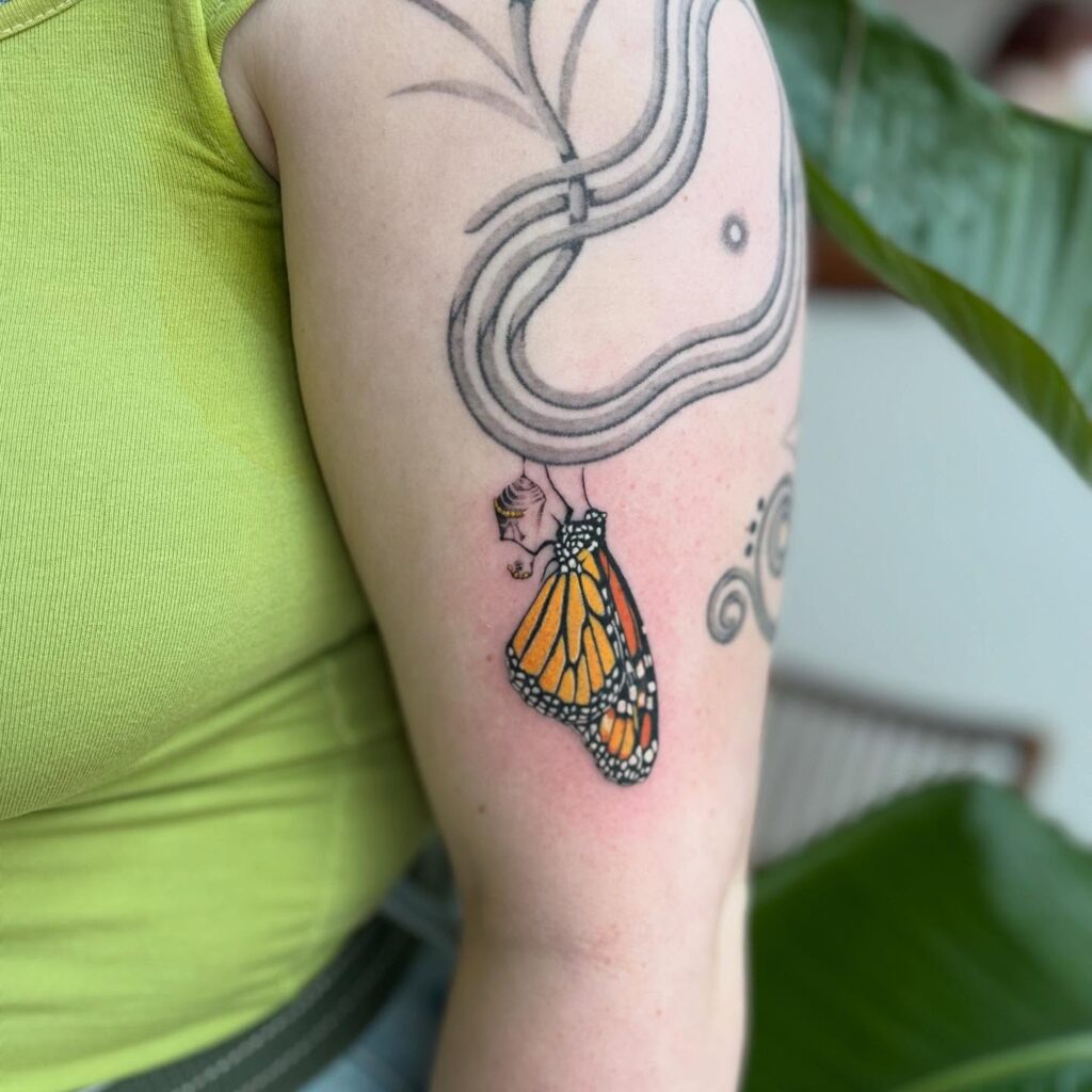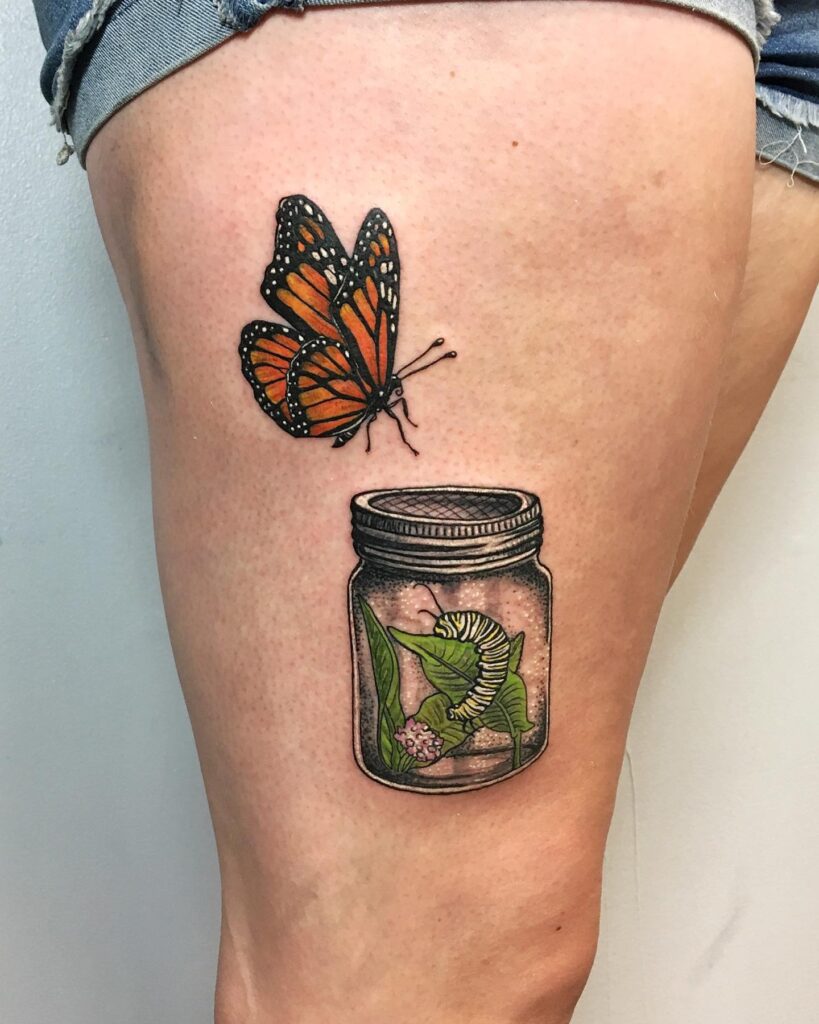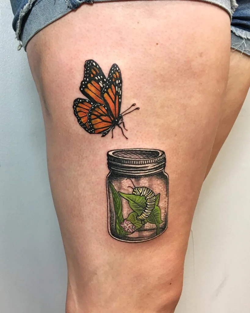 This tattoo beautifully illustrates the full cycle of transformation, showing both the monarch butterfly and its caterpillar form.
